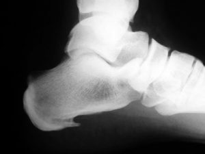 El diagnóstico se realiza a través de la anamnesis y la exploración física. En las pruebas de imagen (radiografía, ecografía…) se puede apreciar a veces, un espolón en el calcáneo (figura 3) o un engrosamiento de la fascia. Pero en pacientes asintomáticos también se pueden apreciar este tipo de hallazgos. Lo más importante es que aunque el diagnóstico por imagen puede ser usado en el manejo clínico de la fascitis plantar, generalmente no cambia el tratamiento del paciente.